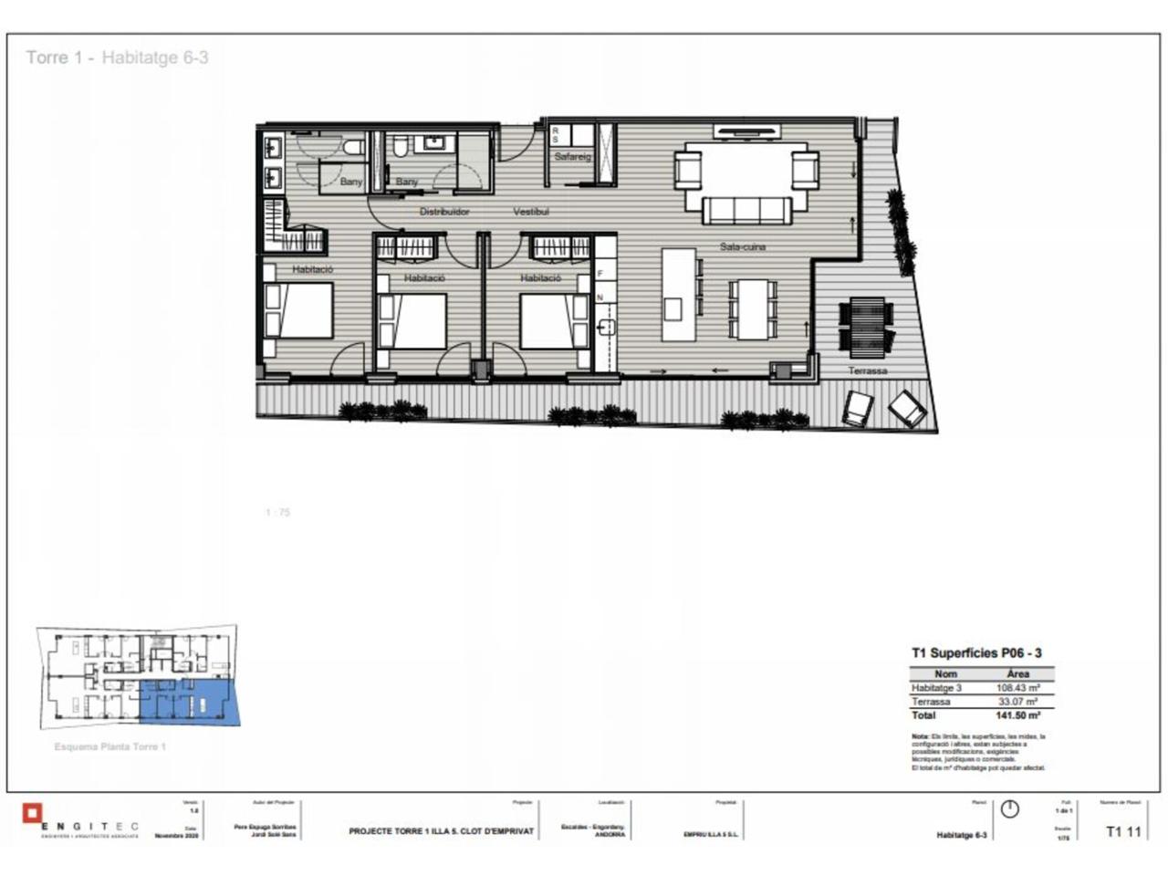 Pis de nova construcció d’alt standing en venda al centre d’Escaldes. Al punt més alt del Clot d’Emprivat es construeix un conjunt arquitectònic singular de tres torres en una mateixa illa urbana, amb l’obertura de façanes als 4 carrers (Consell de la Terra, Nacions Unides, François Mitterrand i Constitució). El projecte comprèn la construcció de tres torres de 10, 15 i 20 plantes i comptarà amb 274 places d’aparcament i 103 trasters. La primera fase s’inicia amb la torre de 15 plantes i tindrà la següent distribució: -Tres plantes comercials -Sis habitatges de dues habitacions de 74 i 85m² -Vint-i-cinc habitatges de tres habitacions de 98 i 111m² -Vuit habitatges de quatre habitacions entre 118 i 141m² Tots els habitatges disposen de terrasses perimetrals amb vistes panoràmiques d’una superfície d’entre 11 i 32m². Amb uns acabats de màxima qualitat i una aposta per l’eficiència energètica (climatització amb aerotèrmica). El preu de la plaça d´aparcament és a partir de 34.000 euros i el traster a partir de 5.000 euros.