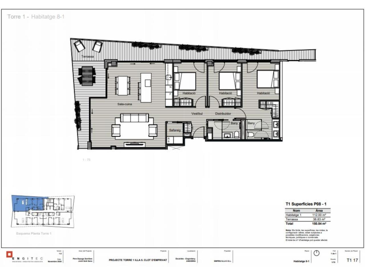Pis de nova construcció d’alt standing en venda al centre d’Escaldes. Al punt més alt del Clot d’Emprivat es construeix un conjunt arquitectònic singular de tres torres en una mateixa illa urbana, amb l’obertura de façanes als 4 carrers (Consell de la Terra, Nacions Unides, François Mitterrand i Constitució). El projecte comprèn la construcció de tres torres de 10, 15 i 20 plantes i comptarà amb 274 places d’aparcament i 103 trasters. La primera fase s’inicia amb la torre de 15 plantes i tindrà la següent distribució: -Tres plantes comercials -Sis habitatges de dues habitacions de 74 i 85m² -Vint-i-cinc habitatges de tres habitacions de 98 i 111m² -Vuit habitatges de quatre habitacions entre 118 i 141m² Tots els habitatges disposen de terrasses perimetrals amb vistes panoràmiques d’una superfície d’entre 11 i 32m². Amb uns acabats de màxima qualitat i una aposta per l’eficiència energètica (climatització amb aerotèrmica). El preu de la plaça d´aparcament és a partir de 34.000 euros i el traster a partir de 5.000 euros.