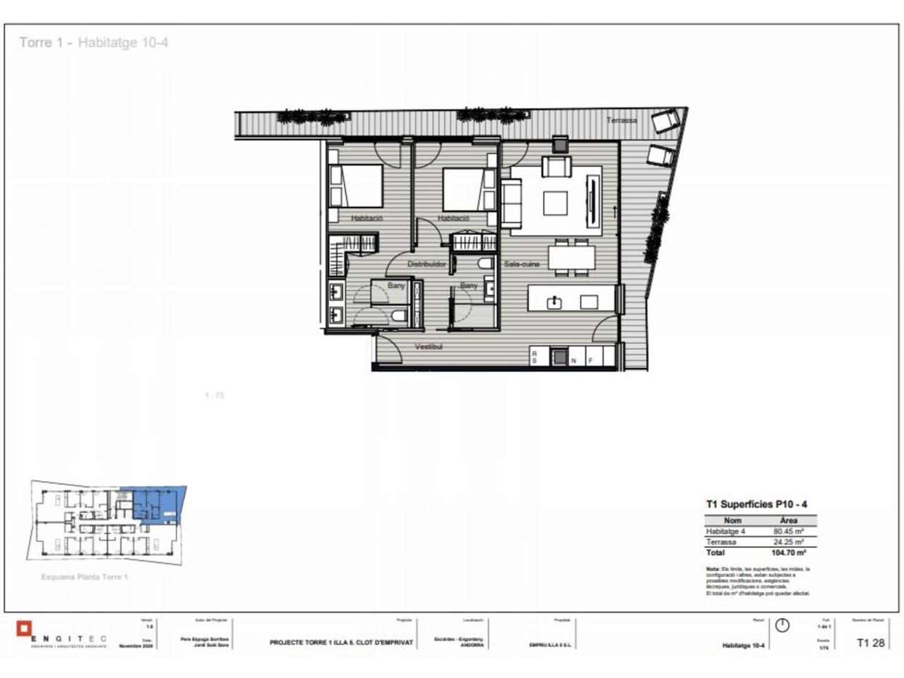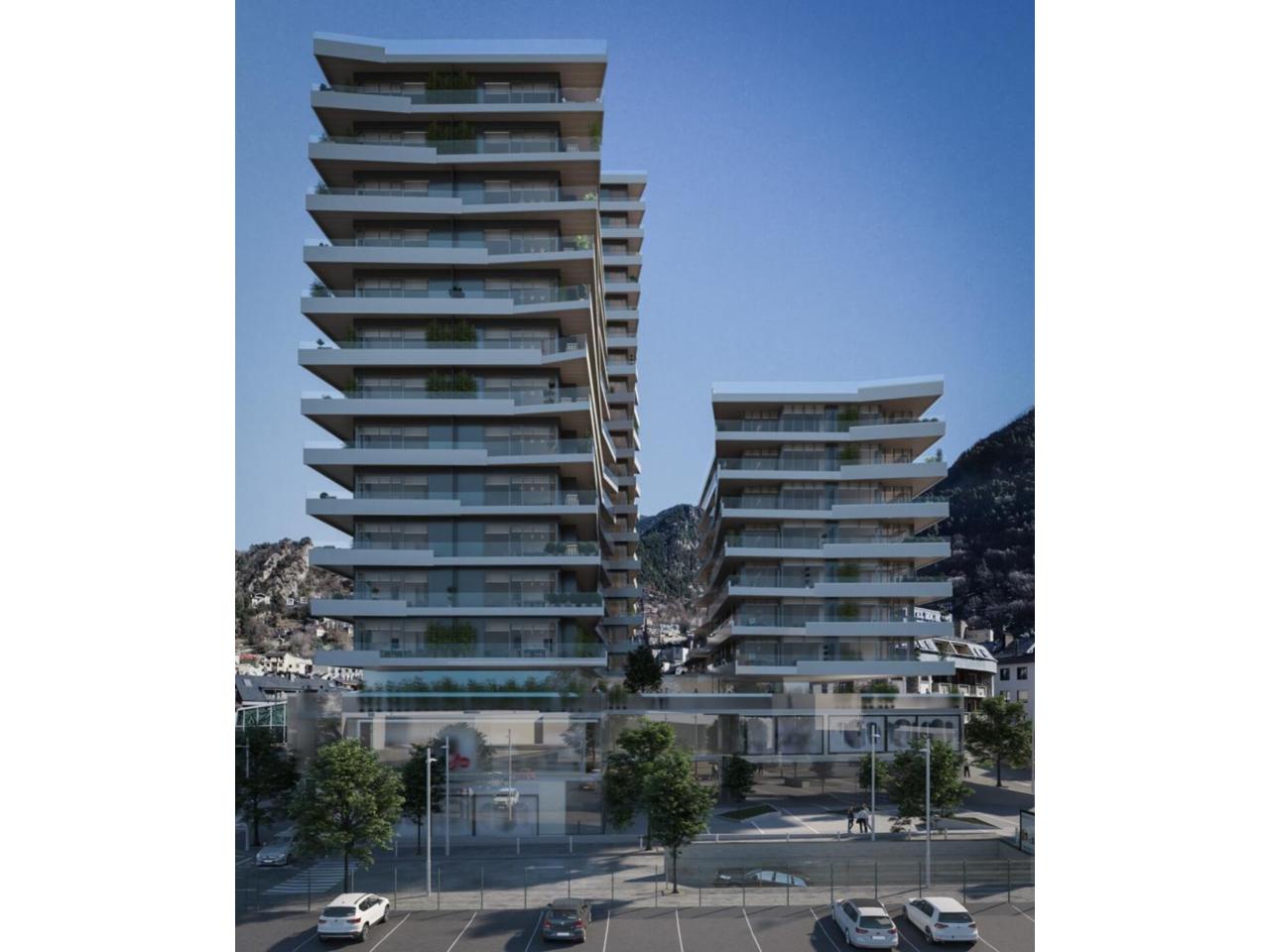 Pis de nova construcció d’alt standing en venda al centre d’Escaldes. Al punt més alt del Clot d’Emprivat es construeix un conjunt arquitectònic singular de tres torres en una mateixa illa urbana, amb l’obertura de façanes als 4 carrers (Consell de la Terra, Nacions Unides, François Mitterrand i Constitució). El projecte comprèn la construcció de tres torres de 10, 15 i 20 plantes i comptarà amb 274 places d’aparcament i 103 trasters. La primera fase s’inicia amb la torre de 15 plantes i tindrà la següent distribució: -Tres plantes comercials -Sis habitatges de dues habitacions de 74 i 85m² -Vint-i-cinc habitatges de tres habitacions de 98 i 111m² -Vuit habitatges de quatre habitacions entre 118 i 141m² Tots els habitatges disposen de terrasses perimetrals amb vistes panoràmiques d’una superfície d’entre 11 i 32m². Amb uns acabats de màxima qualitat i una aposta per l’eficiència energètica (climatització amb aerotèrmica). El preu de la plaça d´aparcament és a partir de 34.000 euros i el traster a partir de 5.000 euros.