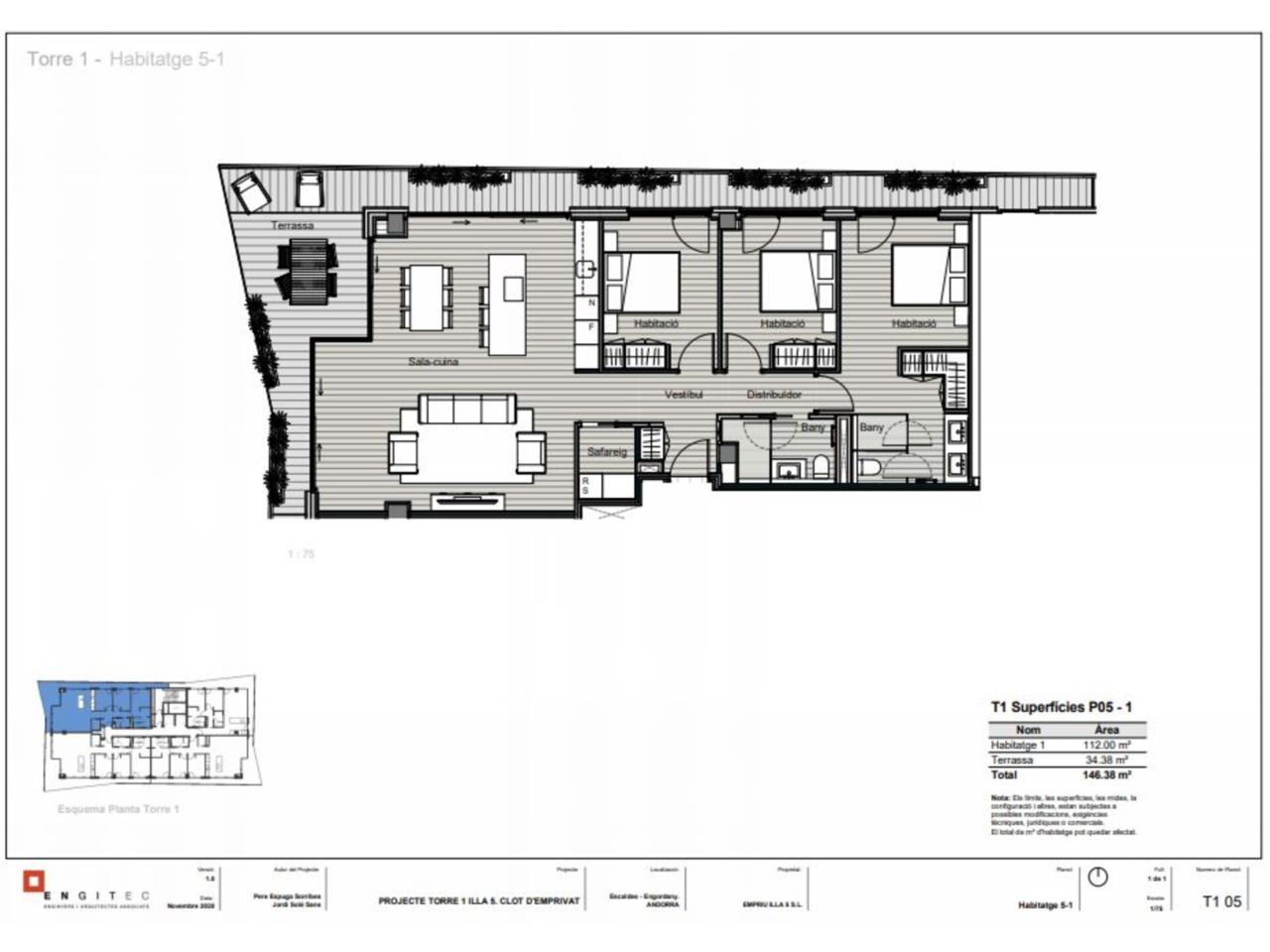 Pis de nova construcció d’alt standing en venda al centre d’Escaldes. Al punt més alt del Clot d’Emprivat es construeix un conjunt arquitectònic singular de tres torres en una mateixa illa urbana, amb l’obertura de façanes als 4 carrers (Consell de la Terra, Nacions Unides, François Mitterrand i Constitució). El projecte comprèn la construcció de tres torres de 10, 15 i 20 plantes i comptarà amb 274 places d’aparcament i 103 trasters. La primera fase s’inicia amb la torre de 15 plantes i tindrà la següent distribució: -Tres plantes comercials -Sis habitatges de dues habitacions de 74 i 85m² -Vint-i-cinc habitatges de tres habitacions de 98 i 111m² -Vuit habitatges de quatre habitacions entre 118 i 141m² Tots els habitatges disposen de terrasses perimetrals amb vistes panoràmiques d’una superfície d’entre 11 i 32m². Amb uns acabats de màxima qualitat i una aposta per l’eficiència energètica (climatització amb aerotèrmica). El preu de la plaça d´aparcament és a partir de 34.000 euros i el traster a partir de 5.000 euros.