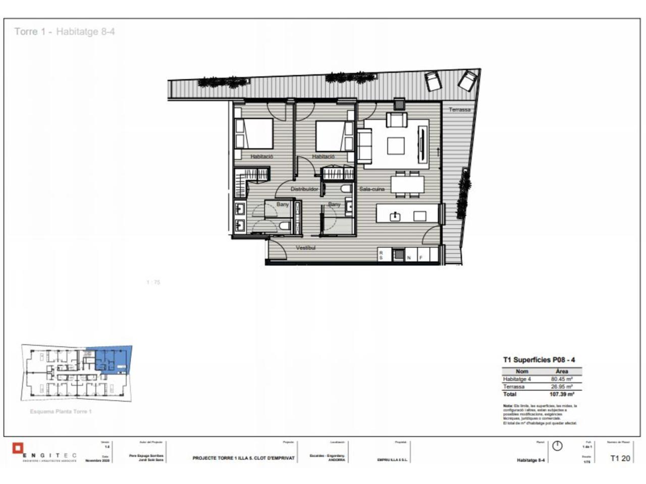 Pis de nova construcció d’alt standing en venda al centre d’Escaldes. Al punt més alt del Clot d’Emprivat es construeix un conjunt arquitectònic singular de tres torres en una mateixa illa urbana, amb l’obertura de façanes als 4 carrers (Consell de la Terra, Nacions Unides, François Mitterrand i Constitució). El projecte comprèn la construcció de tres torres de 10, 15 i 20 plantes i comptarà amb 274 places d’aparcament i 103 trasters. La primera fase s’inicia amb la torre de 15 plantes i tindrà la següent distribució: -Tres plantes comercials -Sis habitatges de dues habitacions de 74 i 85m² -Vint-i-cinc habitatges de tres habitacions de 98 i 111m² -Vuit habitatges de quatre habitacions entre 118 i 141m² Tots els habitatges disposen de terrasses perimetrals amb vistes panoràmiques d’una superfície d’entre 11 i 32m². Amb uns acabats de màxima qualitat i una aposta per l’eficiència energètica (climatització amb aerotèrmica). El preu de la plaça d´aparcament és a partir de 34.000 euros i el traster a partir de 5.000 euros.