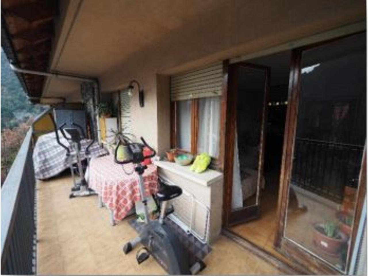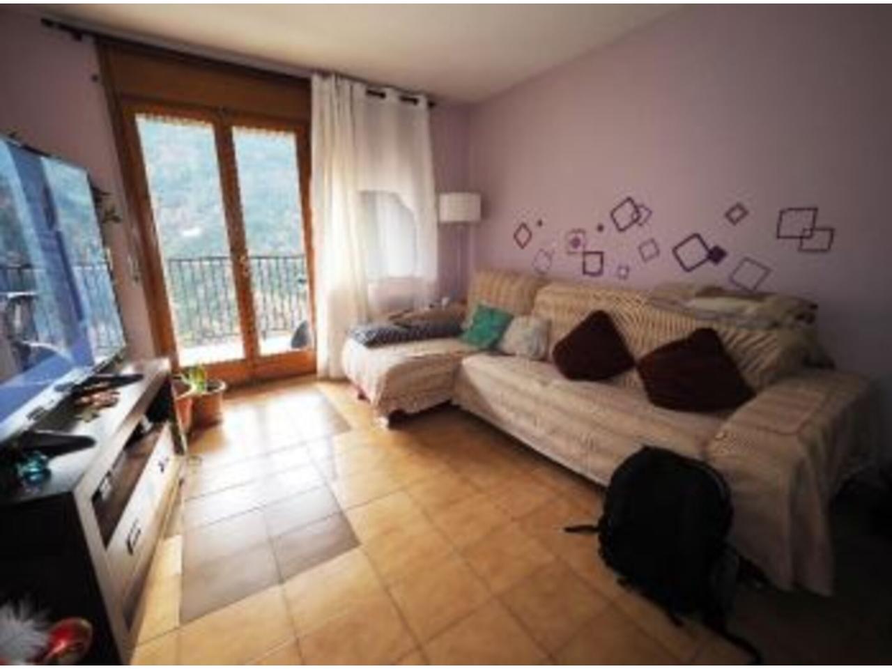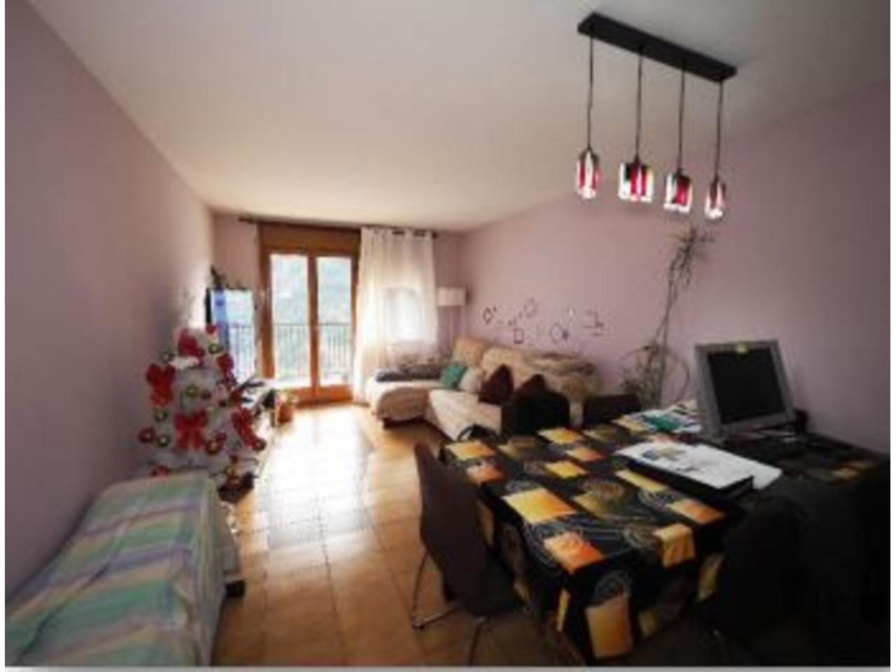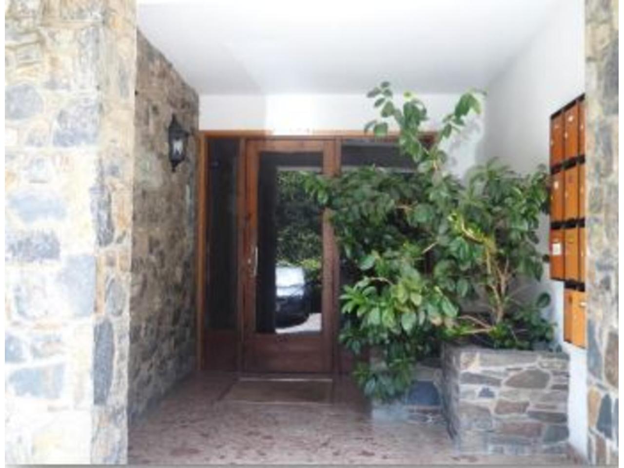 La distribució interior de l´apartament és la següent: A l´entrada trobem un ampli rebedor, amb un armari de paret al davant, i una porta al distribuïdor; per la banda dreta accedim a la cuina a través d´una porta corredissa de fusta i vidre; i per la banda dreta, al saló-menjador, a través d´una obertura sense porta. El saló-menjador, de forma rectangular, dóna accés a la terrassa de l´apartament, d´una superfície de gaire bé 10 m2 , per accedir-hi disposem d´una porta de dues fulles, i al seu costat, una finestra també de dues fulles. Tota la fusteria exterior és de fusta, amb doble vidre. L´orientació de la terrassa, que dóna a la façana principal de l´edifici, és Sud-est, amb sol i vistes sobre la vall. Accedint a la cuina des del rebedor, trobem que el mobiliari es troba a banda i banda d´aquesta, amb una finestra central a la part posterior de l´edifici i una porta lateral al safareig, de bones dimensions, amb una finestra també orientada a la part posterior de l´edifici. Des del distribuïdor, amb forma de ela, trobem dos dormitoris individuals, amb armari encastat al primer i de paret al segon i finestres a la part posterior de l´edifici; a continuació, el bany, amb banyera, terra de gres i enrajolat fins al sostre. Al final del passadís—distribuïdor trobem el dormitori principal, amb armari de paret i accés a la terrassa que comparteix amb el saló; amb porta de dues fulles i una finestra d´una única fulla. El terra és de gres. L´alçada dels sostres és de 2,47 metres, excepte al bany que és de 2,20.